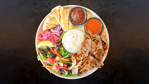 Mix Shish Served with 1 lamb skewer & 1 chicken skewer, Garden Salad, Rice, Turkish Bread And Your Choice Of Two dips.