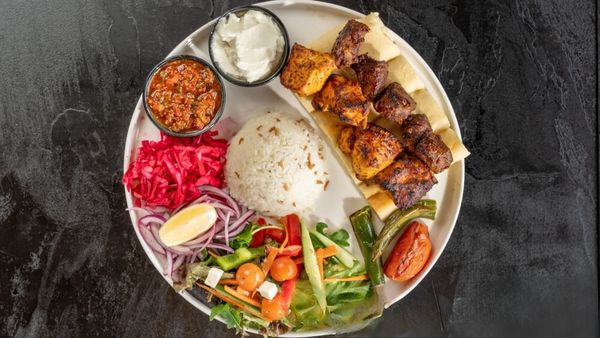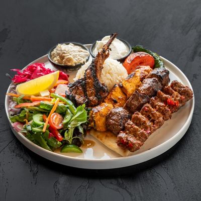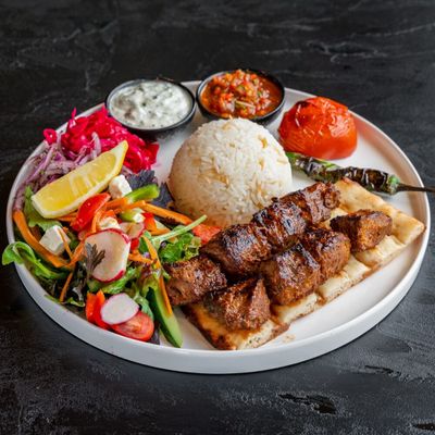 Mix Grill Platter served with 1x Lamb Shish, 1x Chicken Shish, 1x Adana, 1x lamb Cutlet, Garden Salad, Rice, Turkish Bread And Your Choice Of Two dips.