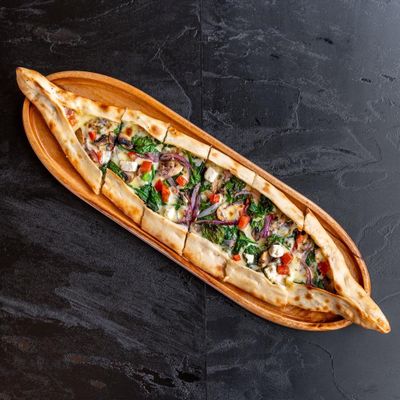 Creamy Garlic Base topped with Avocado, Diced Tomato, Onion, Corn, Jalapeño, Mushroom, Feta Cheese, Mozzarella with a Drizzle of Olive Oil & Chilli Flakes