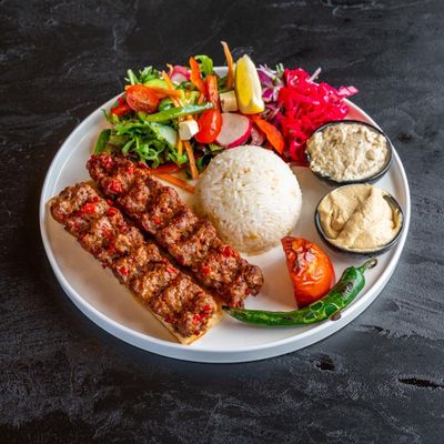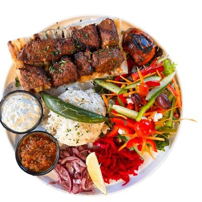 Adana Shish Plate served with 2 Adana Skewers, Garden Salad, Rice, Turkish Bread and Your Choice of Two dips.