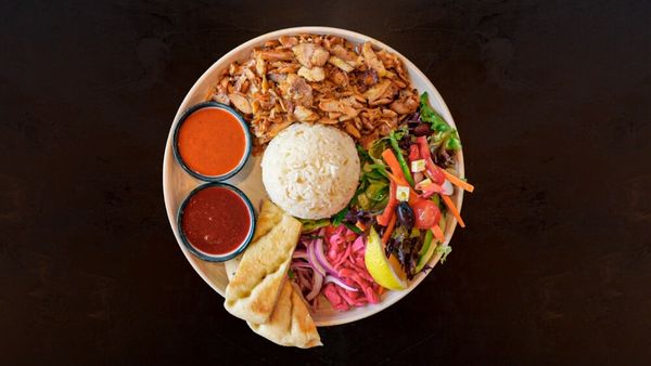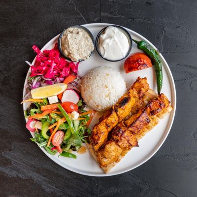 Chicken Shish Plate served with 2 Chicken Skewers, Garden Salad, Rice, Turkish Bread and Your Choice of Two dips.