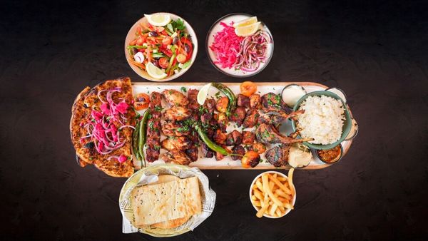Served with Garden Salad, Rice, 2 lamb skewers, 2 chicken skewers, 2 Adana skewers, 4 lamb cutlets, 6 chicken wings, 150 gm of kebab meat (Doner or Chicken), 1 lahmacun, Turkish Bread and 5 dips