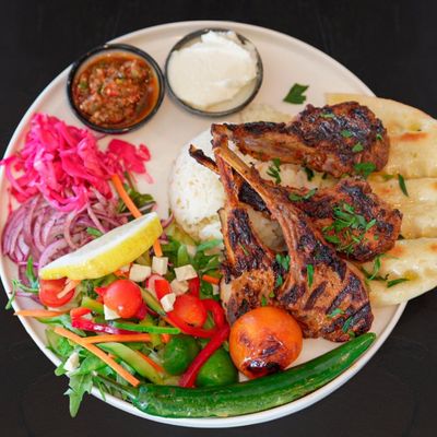 Lamb Cutlet Plates served with 4 Lamb Cutlets, Garden Salad, Rice, Turkish Bread and Your Choice of Two dips.