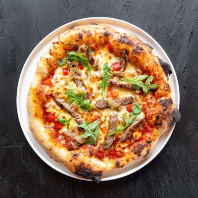 Topped with sliced steak, caramelized onion, roasted red pepper, and mozzarella cheese, drizzled with garlic yoghurt sauce and with fresh rocket